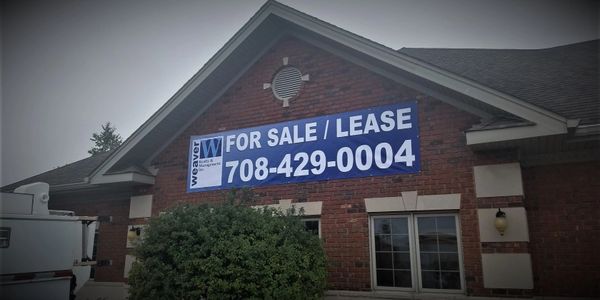 Banners and real estate signs for properties that are available for lease, sale or rent.